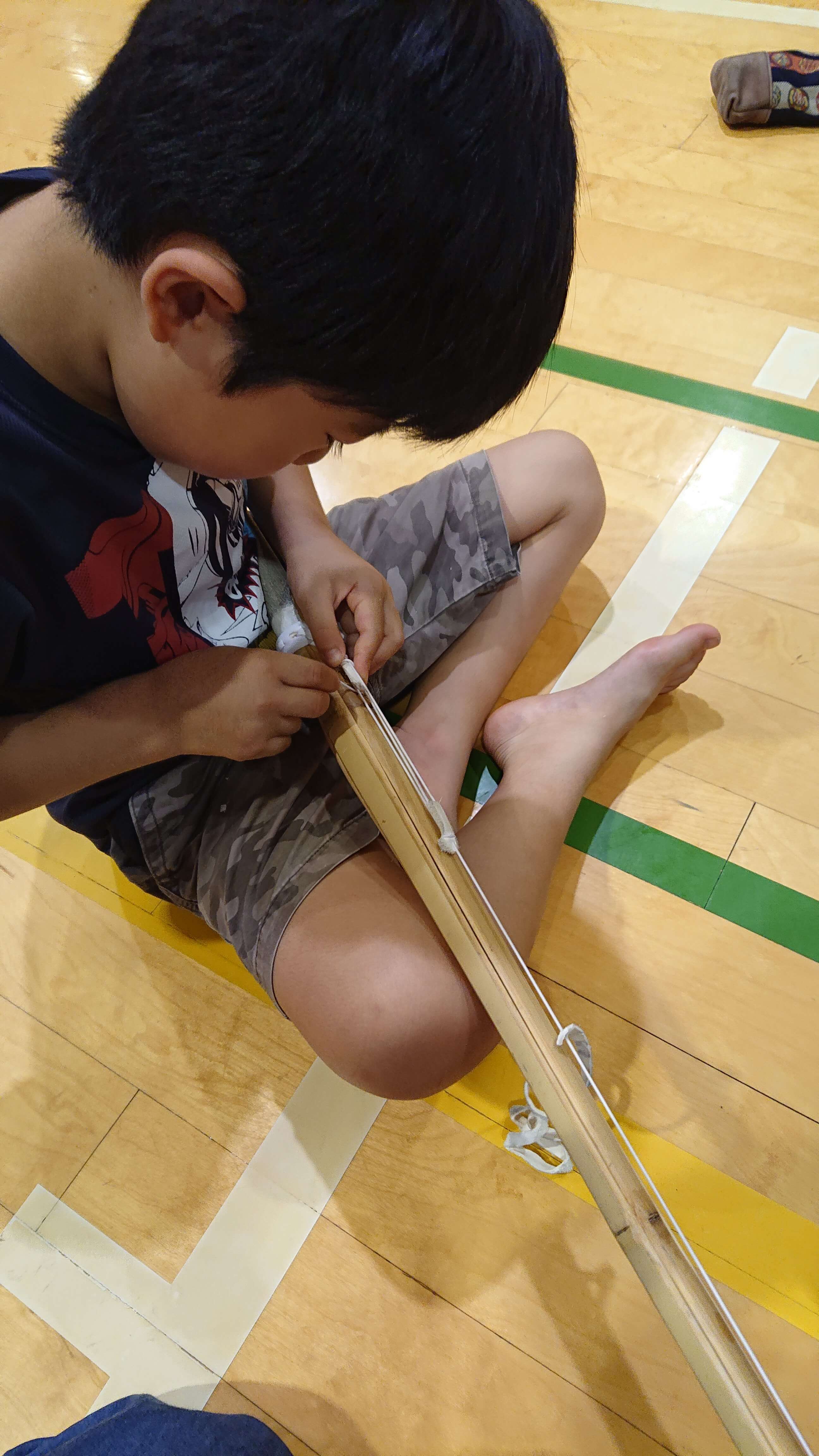 この大会は信大の剣道部のお兄さんお姉さんが、小さな子達に胴着のたたみ方、竹刀の手入れの仕方を教えて下さり、その後はビーチボールやカラーコーンを使って楽しく打ち込みを行い、最後に一人づつに稽古をつけてもらいました。