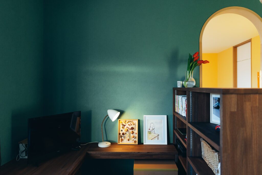 この書斎でまず目を引くのは、壁に採用された深く落ち着いたグリーン。