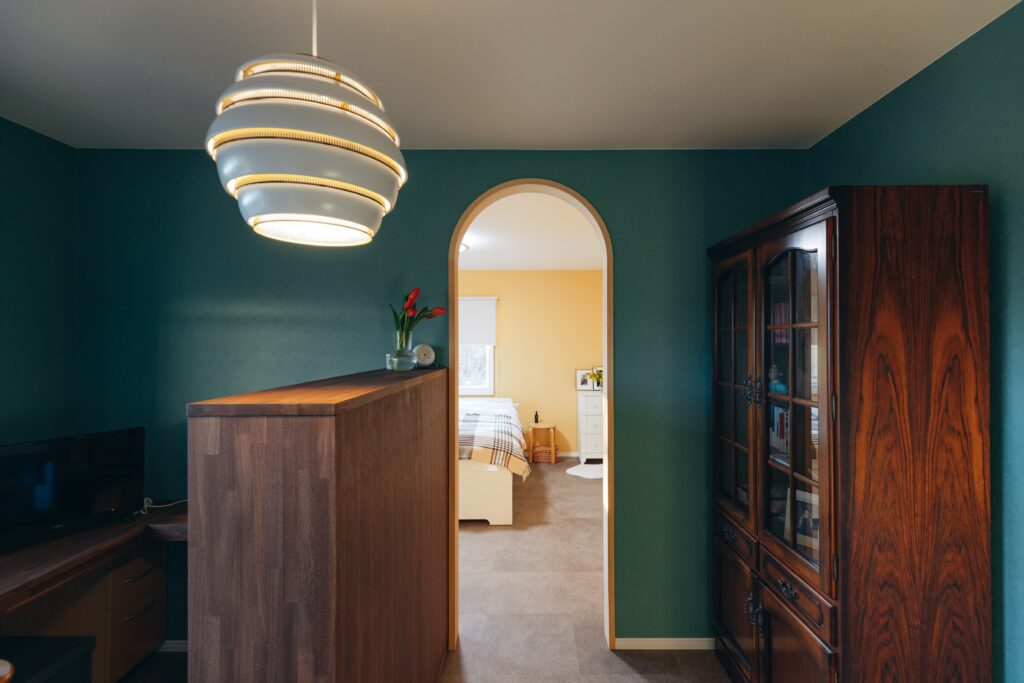 奥の部屋(ご寝室)の明るいイエローの壁との対比を、視覚的なアクセントに。