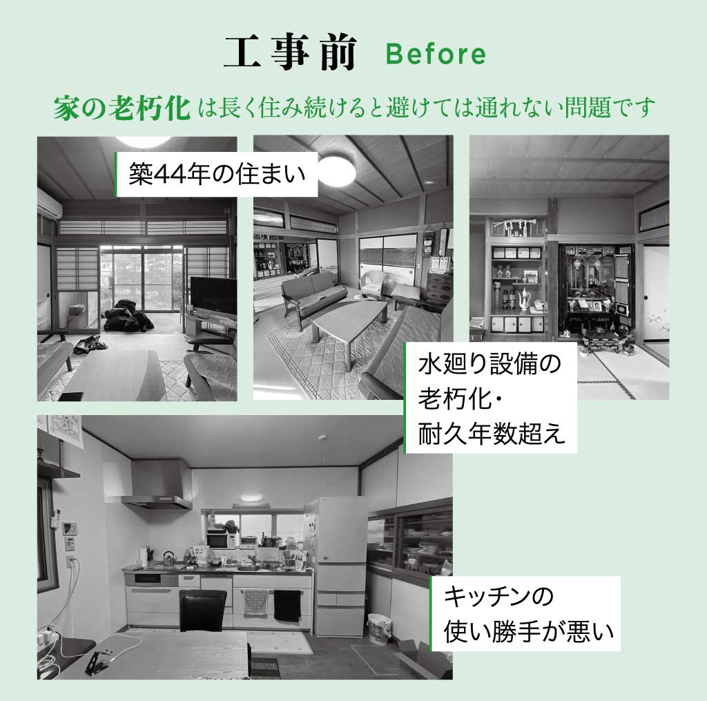 今回の計画において特に重視したのは、使い勝手の悪かったキッチンの間取り変更と、切実な課題であった寒さ対策、そして今後のセカンドライフを見据えて、1階だけでも生活できる空間としました。