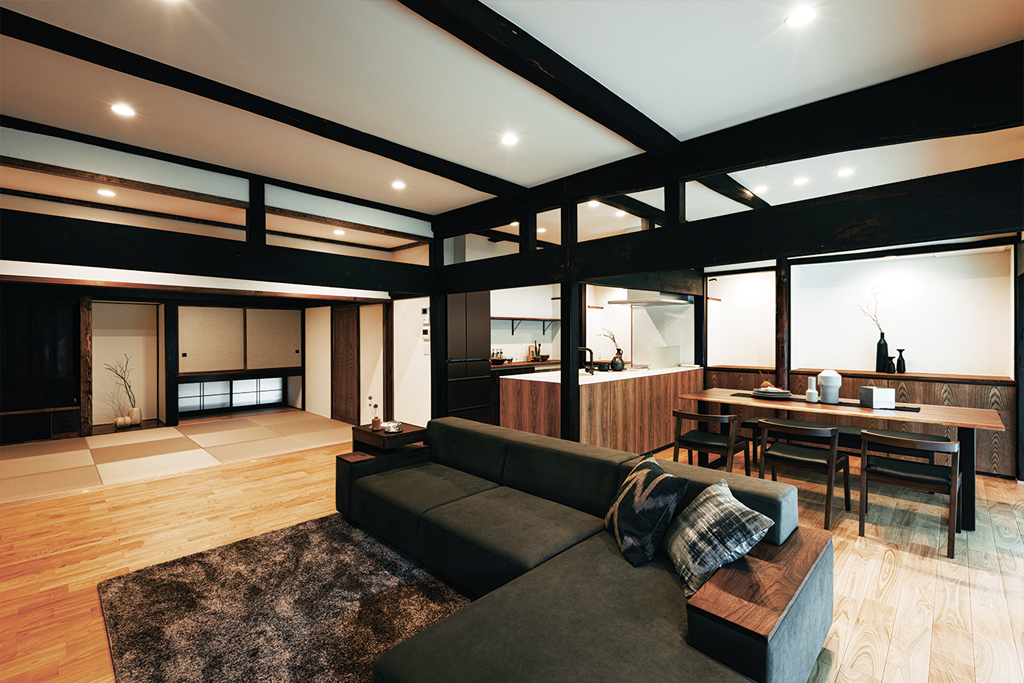 既存の柱や梁の趣を活かしつつ、大胆に間取りを変更。廊下と2室をつなげて生まれ変わった26帖のLDKは広々として親族の集まりにも最適な空間に生まれ変わりました。