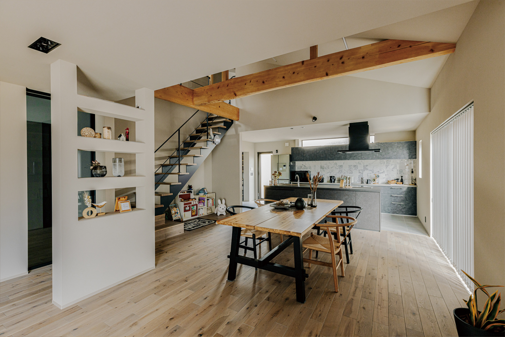 既存の梁が映える洗練されたアーバンスタイル。ゆったりと家族と過ごす時間が待ち遠しくなる、そんなお住まいに仕上がっています。ぜひこの機会にお披露目会場で実際にご体感ください。お待ちしております。