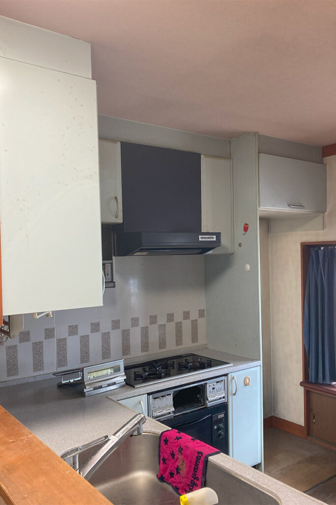 • キッチンの背面には大容量の食器棚を設置。造作なのでスペースにぴったりの棚を設置できます。