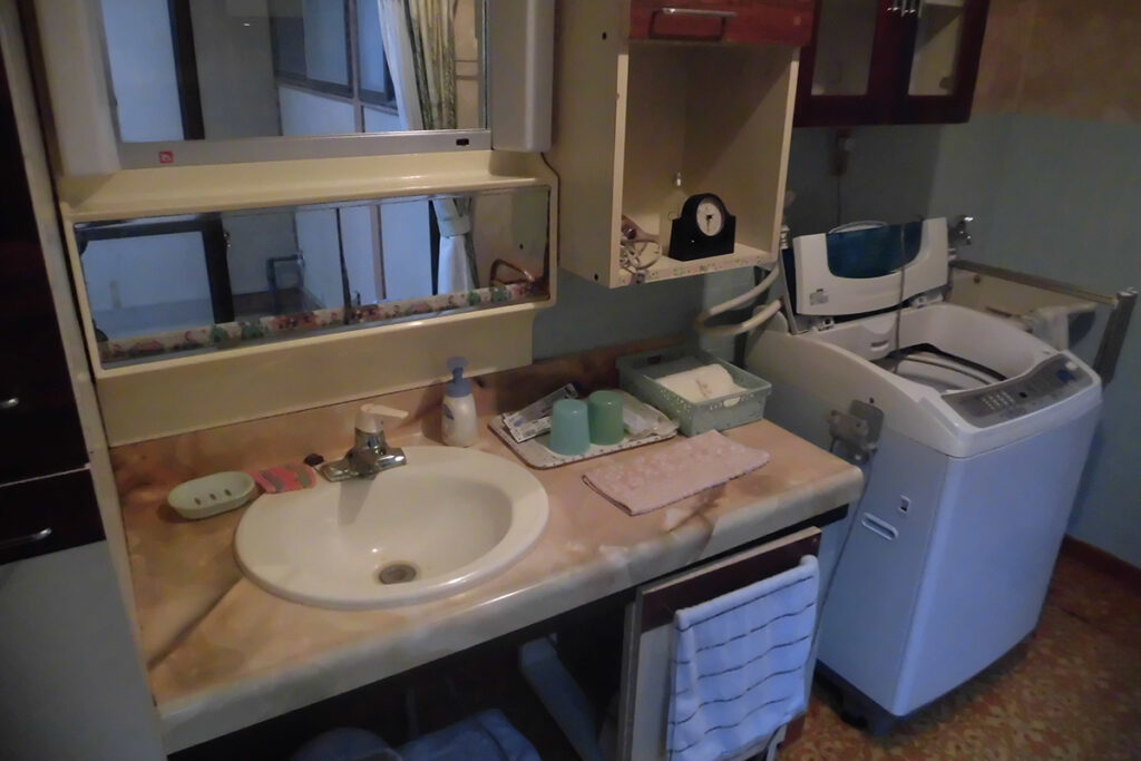 洗面化粧台はTOTOのドレーナ。木の優しさとタイルのシックな雰囲気がきれいにまとまったおしゃれな空間に。収納が豊富にあり、使い勝手の良い洗面脱衣室です。